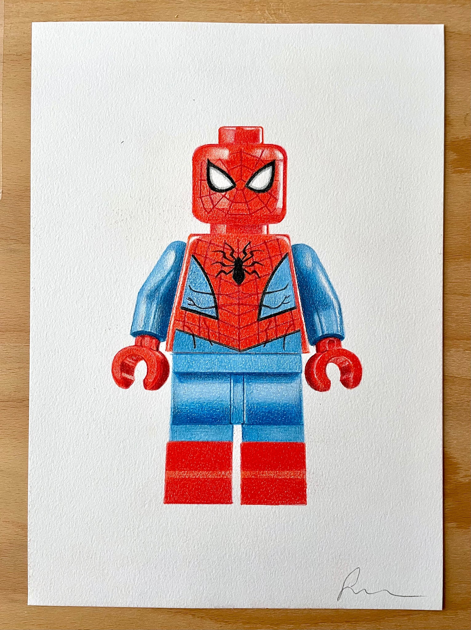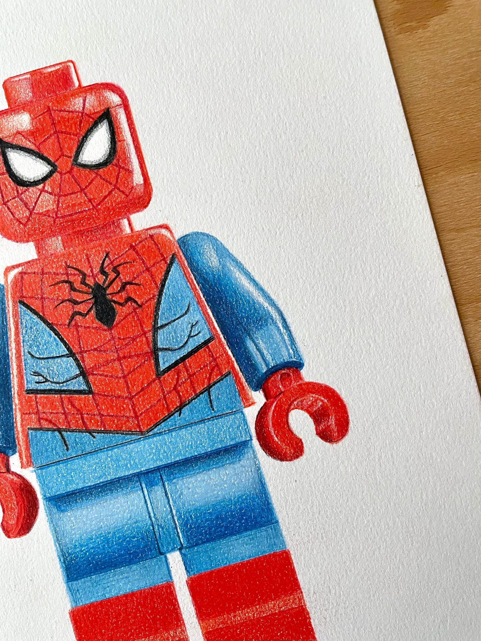 Spiderman Minifigure original colour pencil drawing on heavy cartridge paper signed by the artist Sarah Evans.