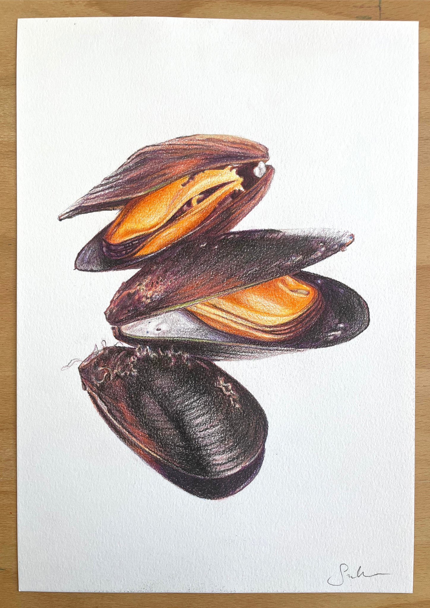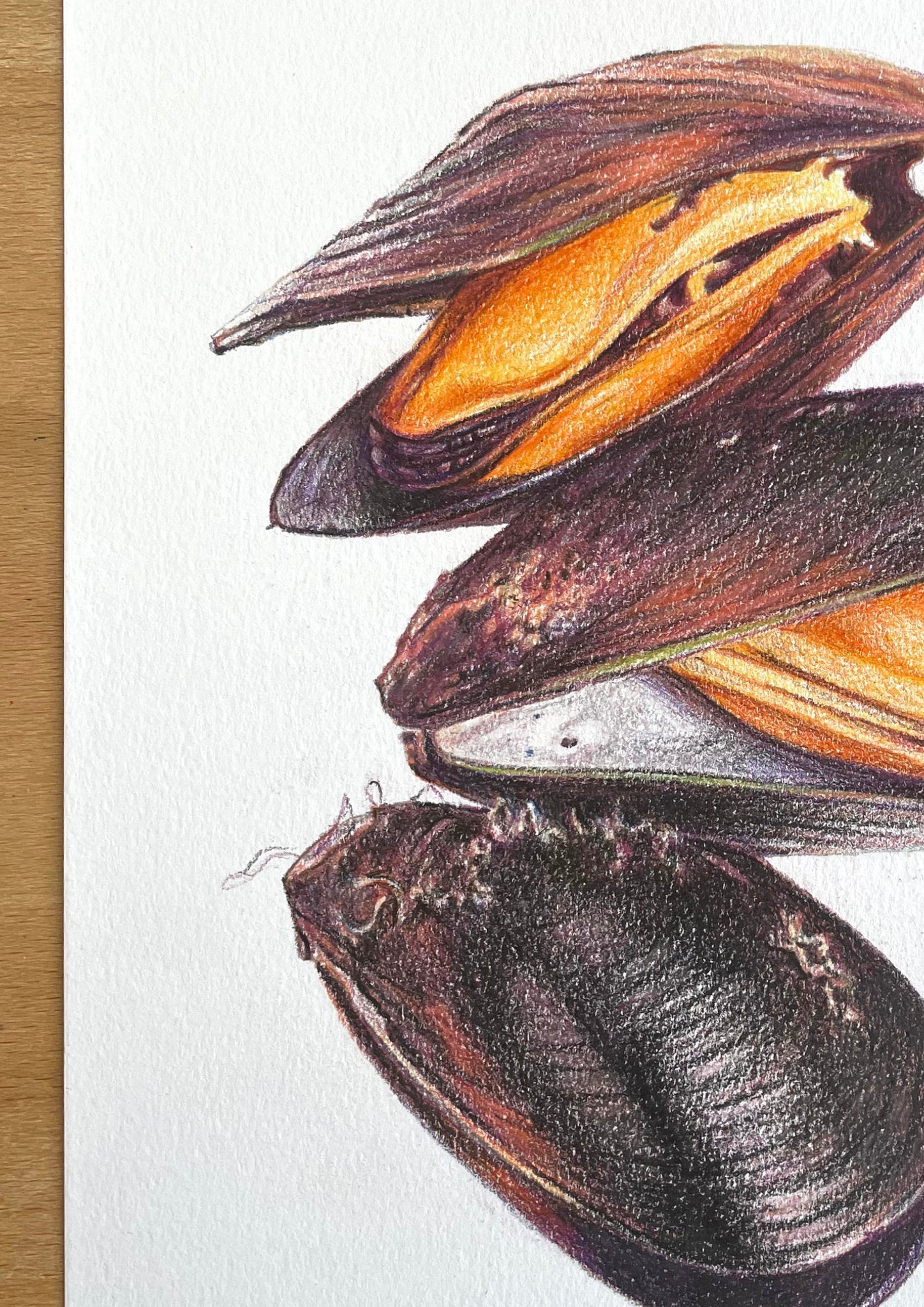 Mussels original colour pencil drawing on heavy cartridge paper signed by the artist Sarah Evans.